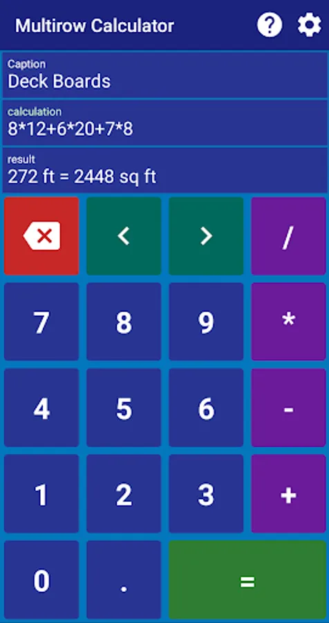 When making a calculation you can enter a main unit and a secondary unit. Give a conversation multiplier, and your calculation result will be automatically converted to the secondary unit, using the given multiplier. For example, using "ft" as the main unit, and "sq ft" as the secondary unit, you can quickly calculate how many square feet you are going to cover with the amount of boards in your calculation. The app will show the result using both the main unit and the secondary unit. But for a simple calculation you can omit either the secondary unit or both units.