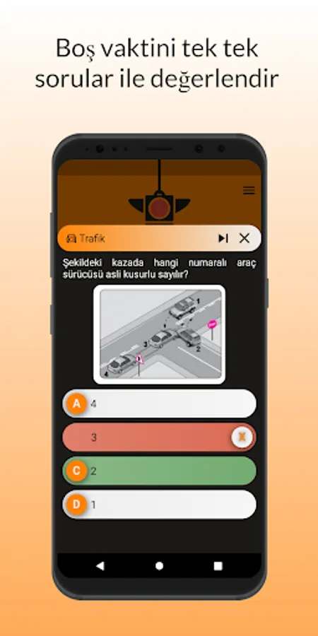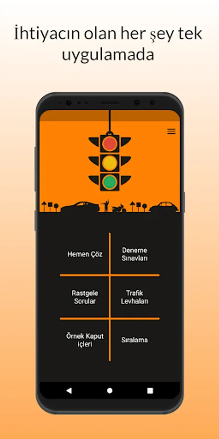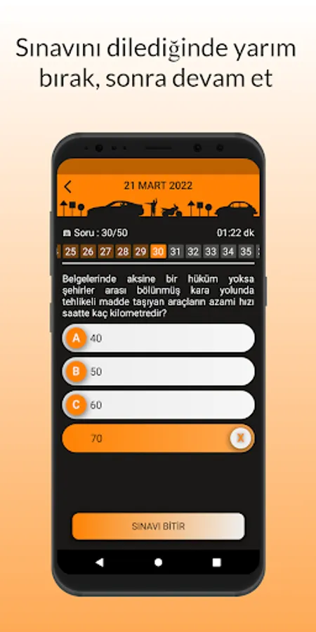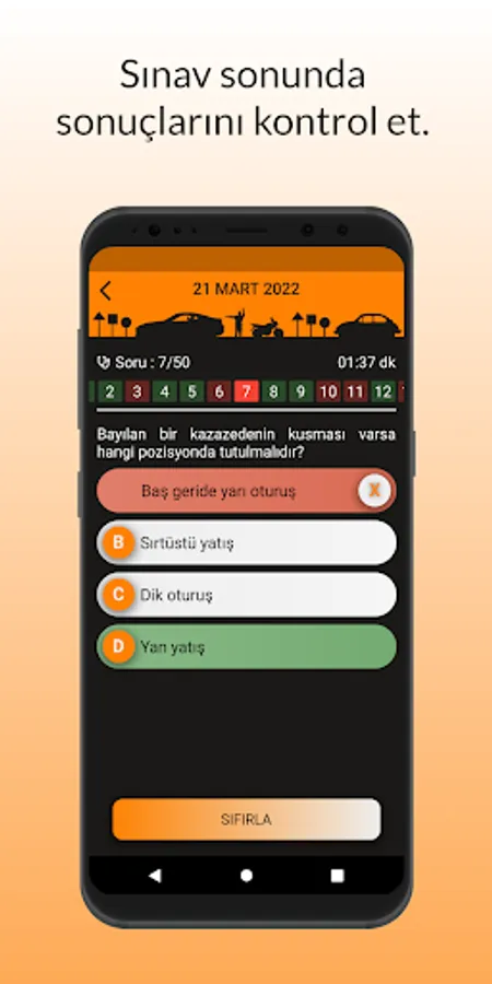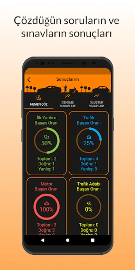 - While preparing for the driver's license exam from the main page, immediately solve questions, take sample trial exams, create exams on the subject and number of your choice, learn horizontal and vertical markings, compete with other users by sharing the exam result, learn the engine parts on the sample vehicle hoods and access the statistics about the questions you have solved immediately .