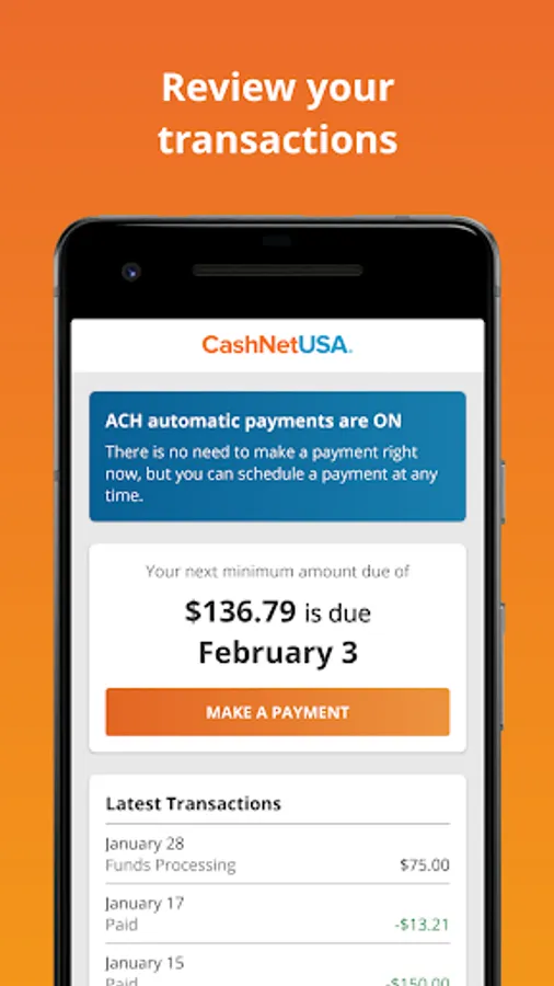 Take control of your line of credit and download the CashNetUSA app today! When you're finished downloading, be sure to turn on auto updates to always have the newest version of the app.