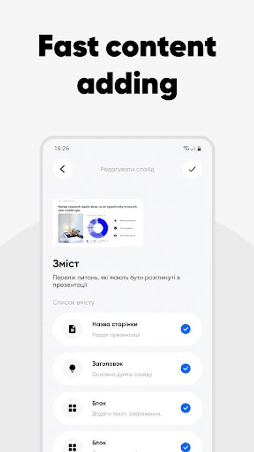 Now creating a high-quality and professional presentation on the phone is very easy and does not require significant effort and time. The application has ready-made pictures and icons, which facilitates the process of filling out the presentation. Express yourself with the personalization of slides and blocks.