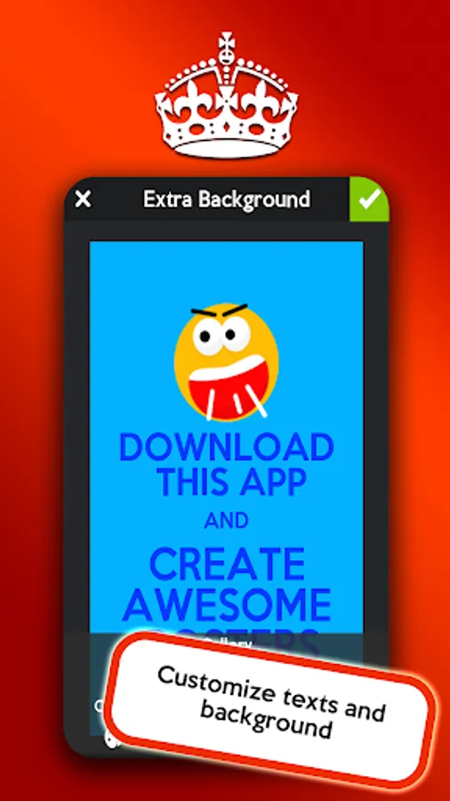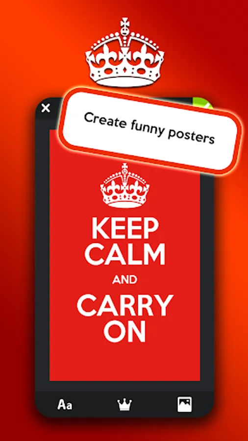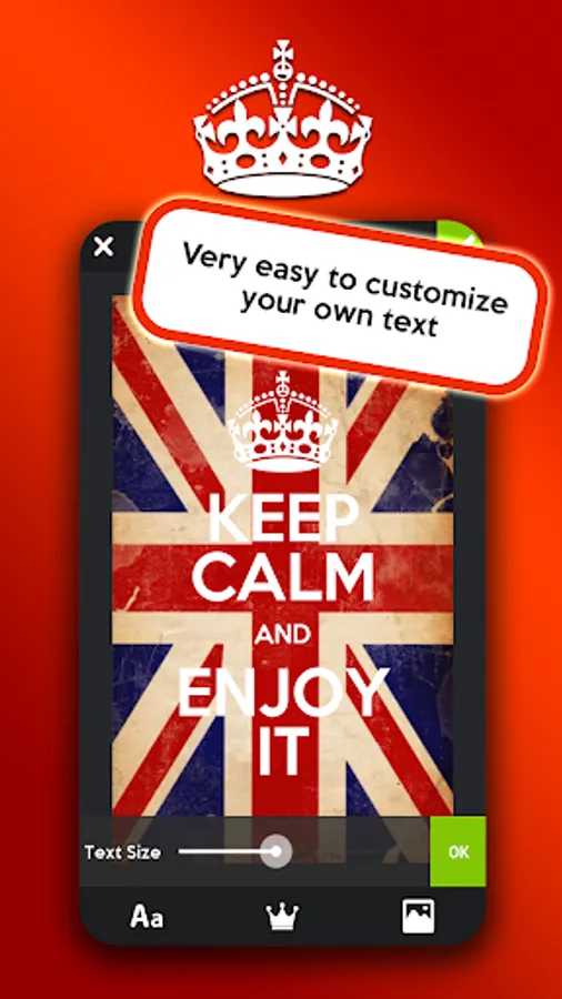 With keep calm poster generator you will be able to modify text, text size and text color. You can change text size, so you can fit any text you want! Here you have the most completed Keep Calm Poster App.