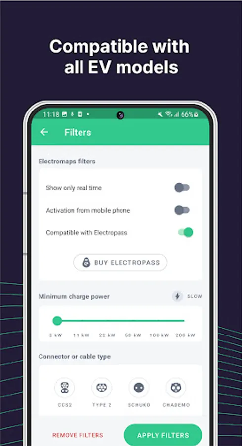 Electromaps allows you to find all available charging stations for electric vehicles and charge at many of them. With Electromaps you can search for charging stations by connector type, power, establishment type, to best suit your needs.