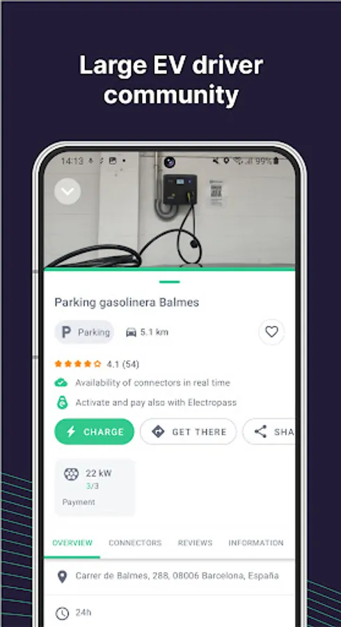 Electromaps has a highly collaborative community of over 200,000 registered users. Check out the photos and comments from other users to find out the charging station's reputation or the directions to find it more easily. Add your comments or images and join our community. You can also add charging stations that are not in our app so that they can be used by other users.