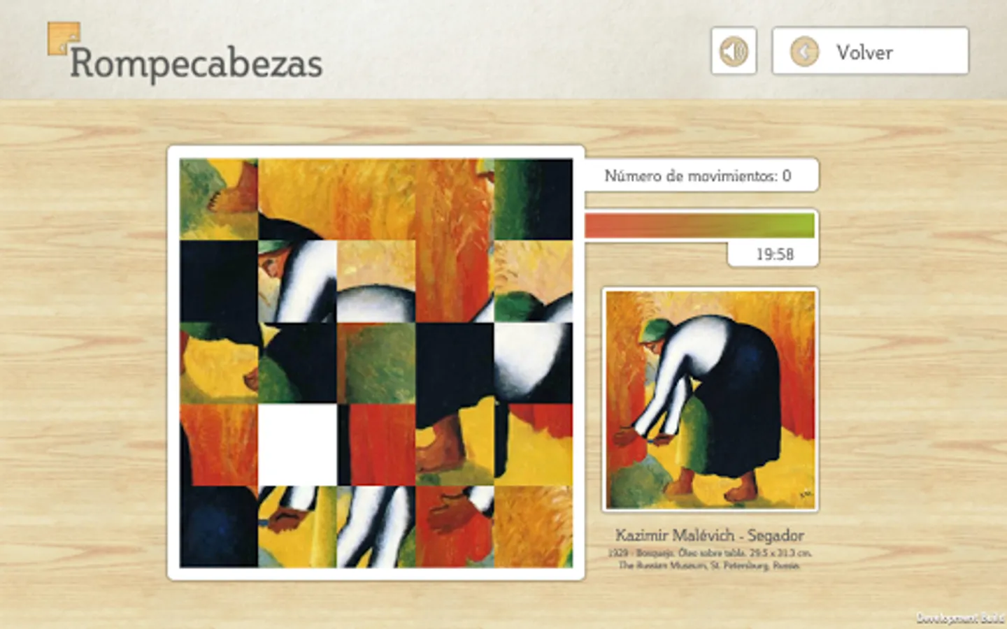 - Puzzle, where the player will have to use the empty space to move the pieces that are disordered in order to reconstruct the sample image. It has a limited time to achieve. There are several sample images to choose from.