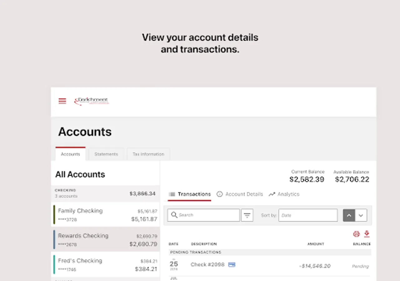 Enrichment's Mobile Banking App makes it easy and secure to manage your finances from anywhere, anytime. You can set text alerts on your account for account activity and view all of your Enrichment accounts in one place.