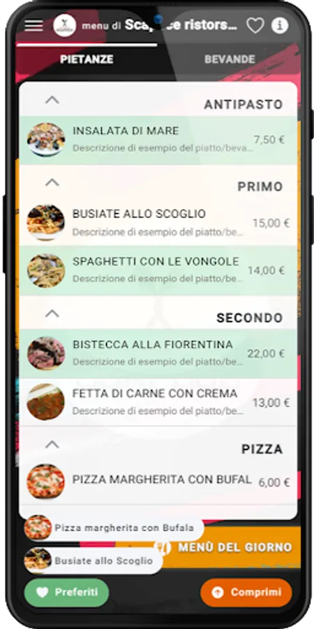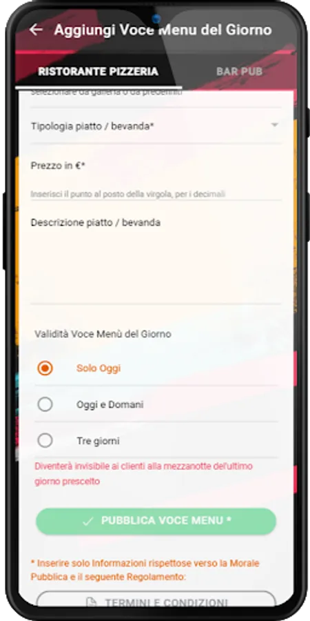 - Add your Menu. Are you the owner of a place (restaurant, bar, pub, pizzeria, ice cream parlor, etc.) and do you want to have a digital MENU that is always updated, easy to implement, quick to modify and free? Download menuApp immediately, register (accepting the conditions of use and correctness of what you enter) and immediately create your personal menu.