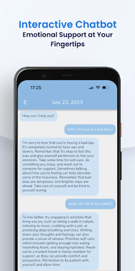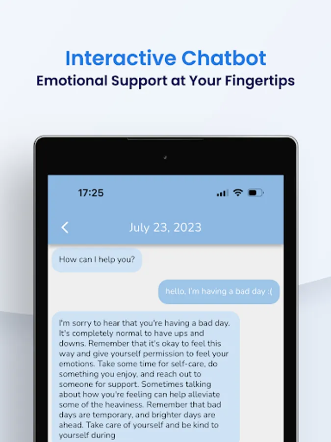 Interactive Chatbot: Meet our empathetic chatbot – a supportive companion available 24/7. Talk freely about your emotions, receive thoughtful responses, and practice emotional self-care.