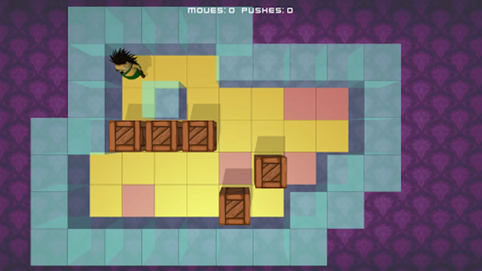 The player is confined to the board, and may move horizontally or vertically onto empty squares (never through walls or boxes). The player can also move into a box, which pushes it into the square beyond. Boxes may not be pushed into other boxes or walls, and they cannot be pulled. The puzzle is solved when all boxes are at storage locations.