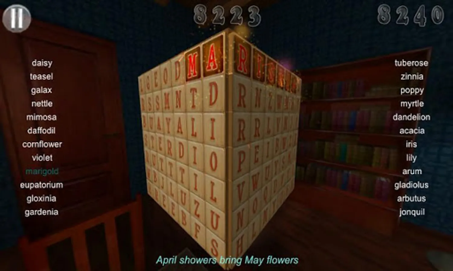 Each side of the box has 7x7 letters and there are 24 words to find in total. It comes with 28 English word categories and all puzzles are laid out with random words from a larger category word list and random positions so you can play each puzzle many times without it ever being the same.
