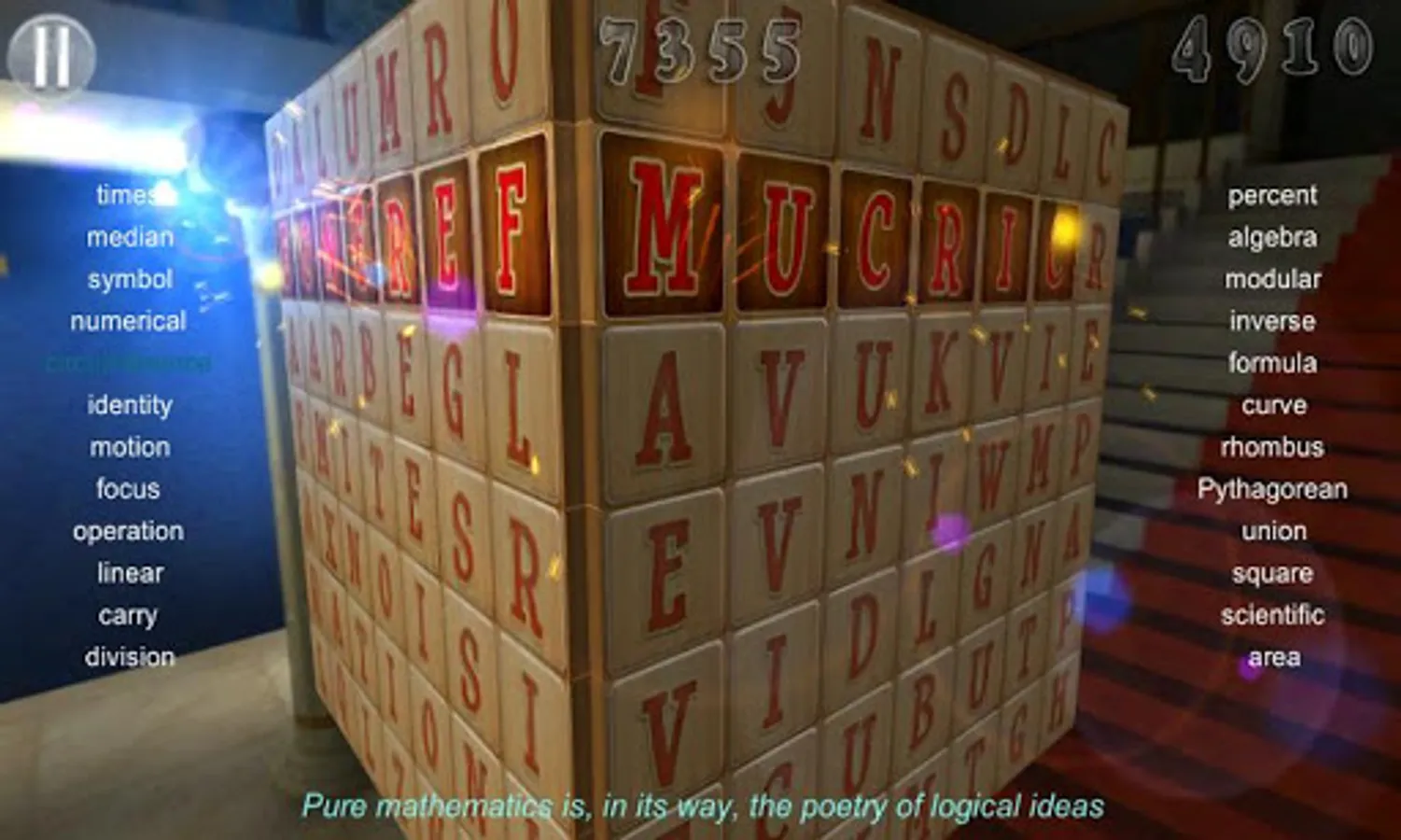 To select a word touch the first letter of the word. Then touch the last letter of the word. You can and may need to spin the cube in between touching the letters. You can actually touch the last letter first and first last. Only touch the letters at the end points and not in the middle of the word. If you select a word correctly all letters will change colors permanently and the last word found will have special effects. If the second letter you touch does not complete a word it becomes the new "first" letter as it is assumed you are trying to find a different word.