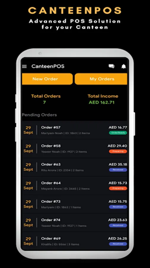Order Management: Canteen can manage the full life cycle of orders through the application with Create New Orders using Student ID, Parent ID, etc., Edit Orders, Cancel Orders, Update Order Status, Add Special Instructions for Chef, Apply for Discount Code, Multiple Payment Modes, Immediate Refund & Print Order wirelessly with any WiFi Printer in own customized format. The best part is every action is integrated into real-time notifications for customers/parents. All orders will be managed through a single-window categorized into different categories (In Process Orders, Completed Orders, Future Orders created by parents & Cancelled Orders).