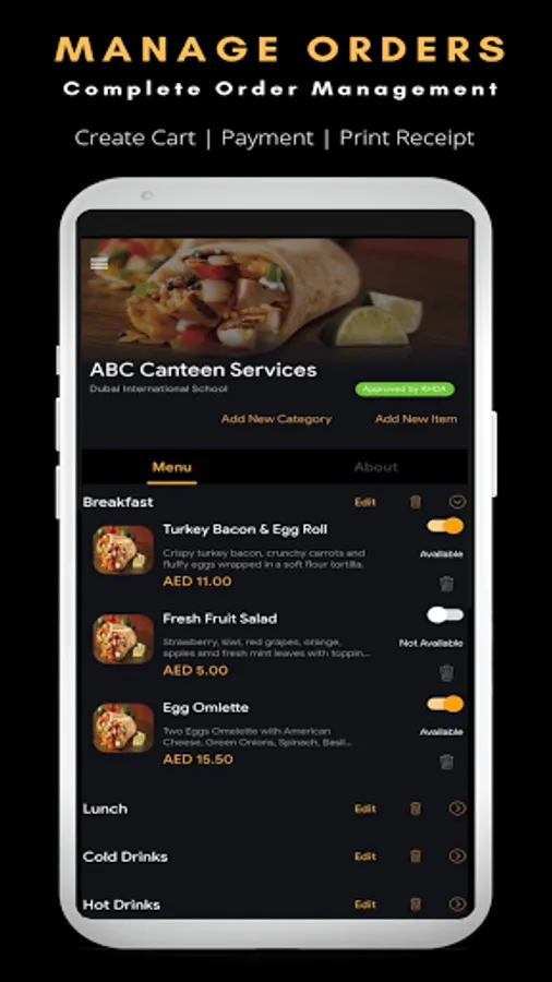 - Manage Availability of Items (make items unavailable/available to hide from menu anytime)