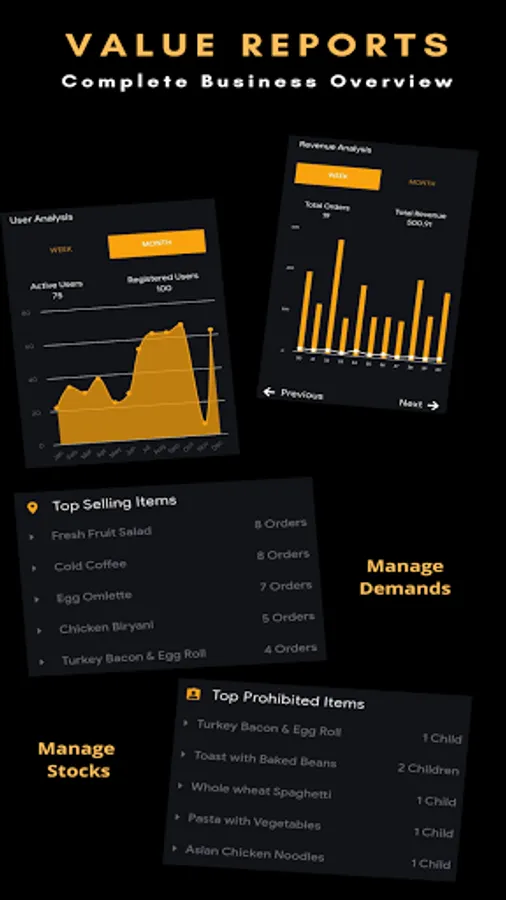 Graphical Reports: The backbone of any business is the ability to analyze its performance and take corrective actions whenever required to generate more business. Our Graphical Dashboard provides you with relevant factors to make the right decisions quickly with easy to use & detailed information available to you in real-time. You have a view of all items which are Best Selling so you can stock them more than others OR items which no one is interested so you can get rid of them & avoid wastage proactively OR get a view of your revenue versus orders growth with a weekly, quarterly or monthly view OR finally user analysis view.