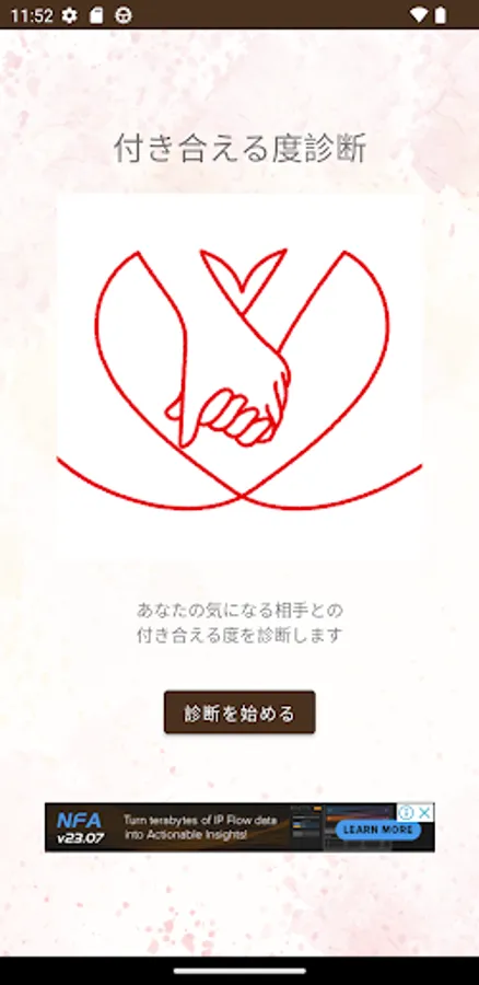 "Dating Diagnosis" is a love diagnosis app that calculates the probability that you can go out with the person you care about by answering only 10 questions. This diagnosis takes into account your current relationship and compatibility with your partner to estimate your potential for a relationship. Don't worry about bad results. This is only the probability at the moment, because the future is not yet known ♪
