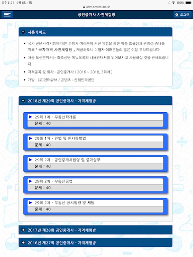 - 2016 ~ 2018년 3개 년 시험이 제공되며 매년 본시험 이후에 체험방 콘텐츠가 추가됩니다.