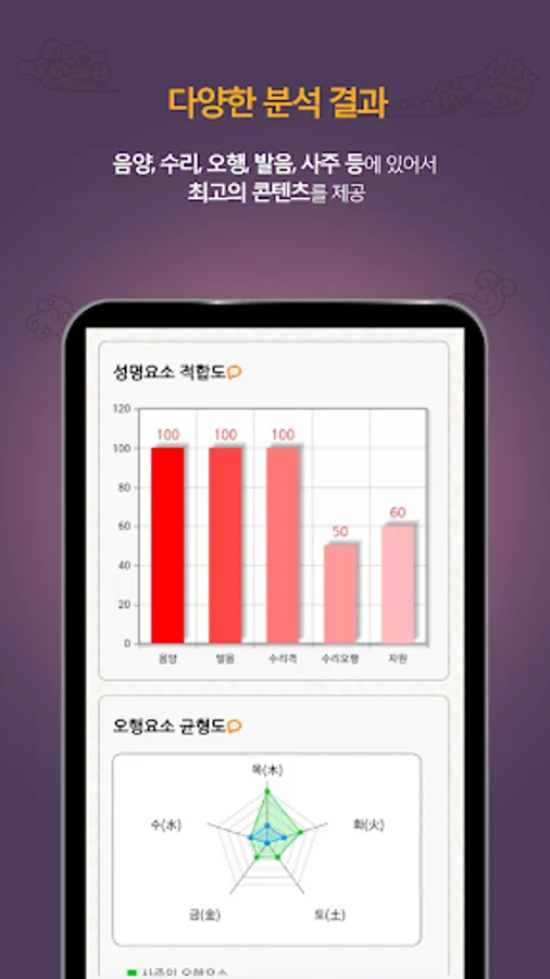 • It provides the analysis graph of the balance of five elements and the balance of naming elements.