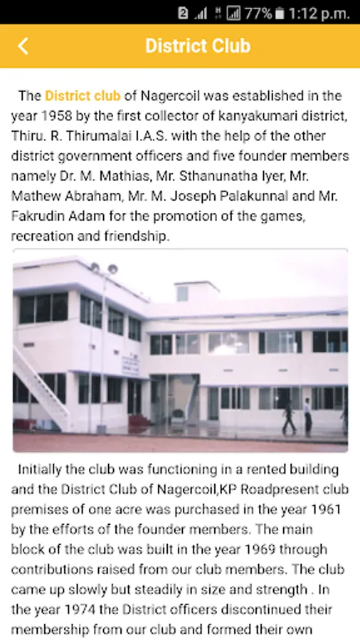 The District club of Nagercoil was established in the year 1958 by the first collector of kanyakumari district, Thiru. R. Thirumalai I.A.S. with the help of the other district government officers and five founder members namely Dr. M. Mathias, Mr. Sthanunatha Iyer, Mr. Mathew Abraham, Mr. M. Joseph Palakunnal and Mr. Fakrudin Adam for the promotion of the games, recreation and friendship.