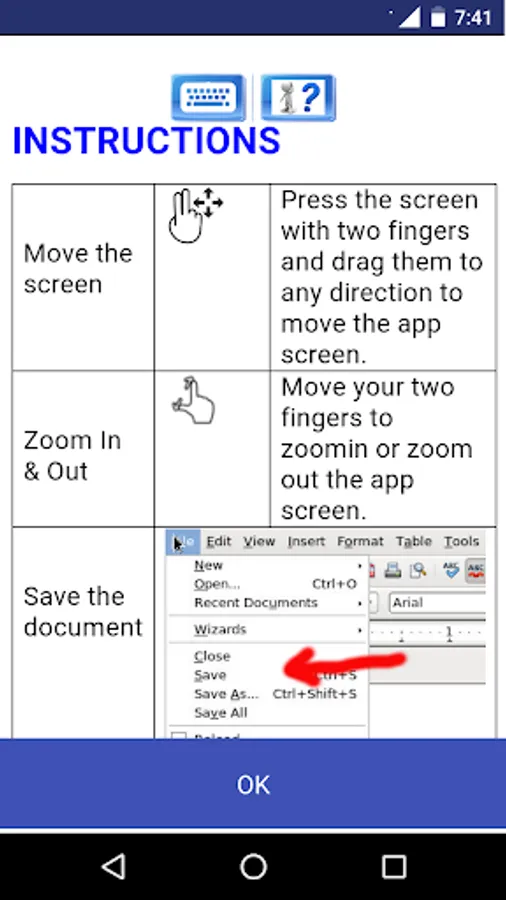 - "Zoom In & Out", swipe your two fingers to zoom in or zoom out the app and document.