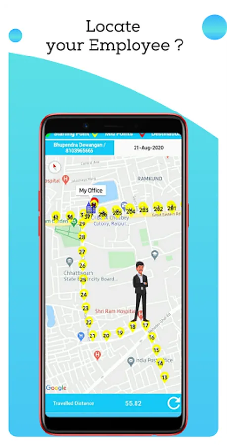 Live Location tracking: Admin can track the real time location with timing of field employees.