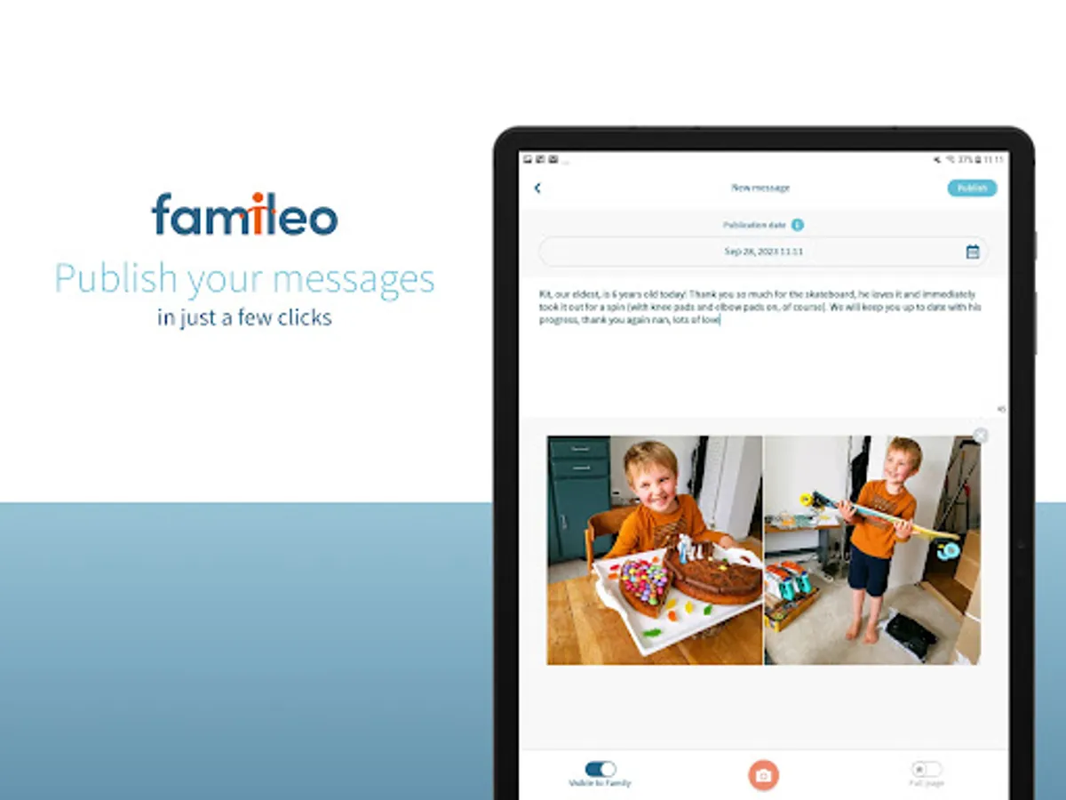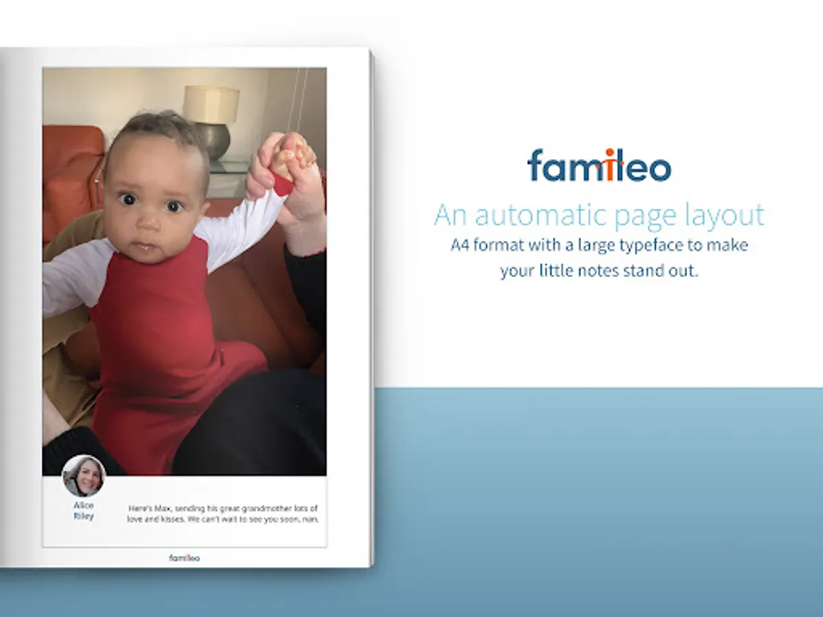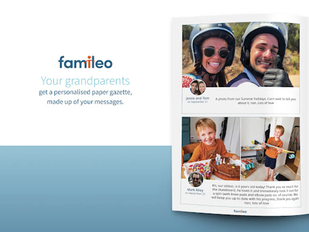 Each family member sends their messages and photos via the application, and Famileo transforms them into a personalised printed gazette. Thanks to the family wall, the entire family can enjoy the stories and photos shared, whenever they like. Grandparents will love reading all about their relatives' news and seeing how much they care!