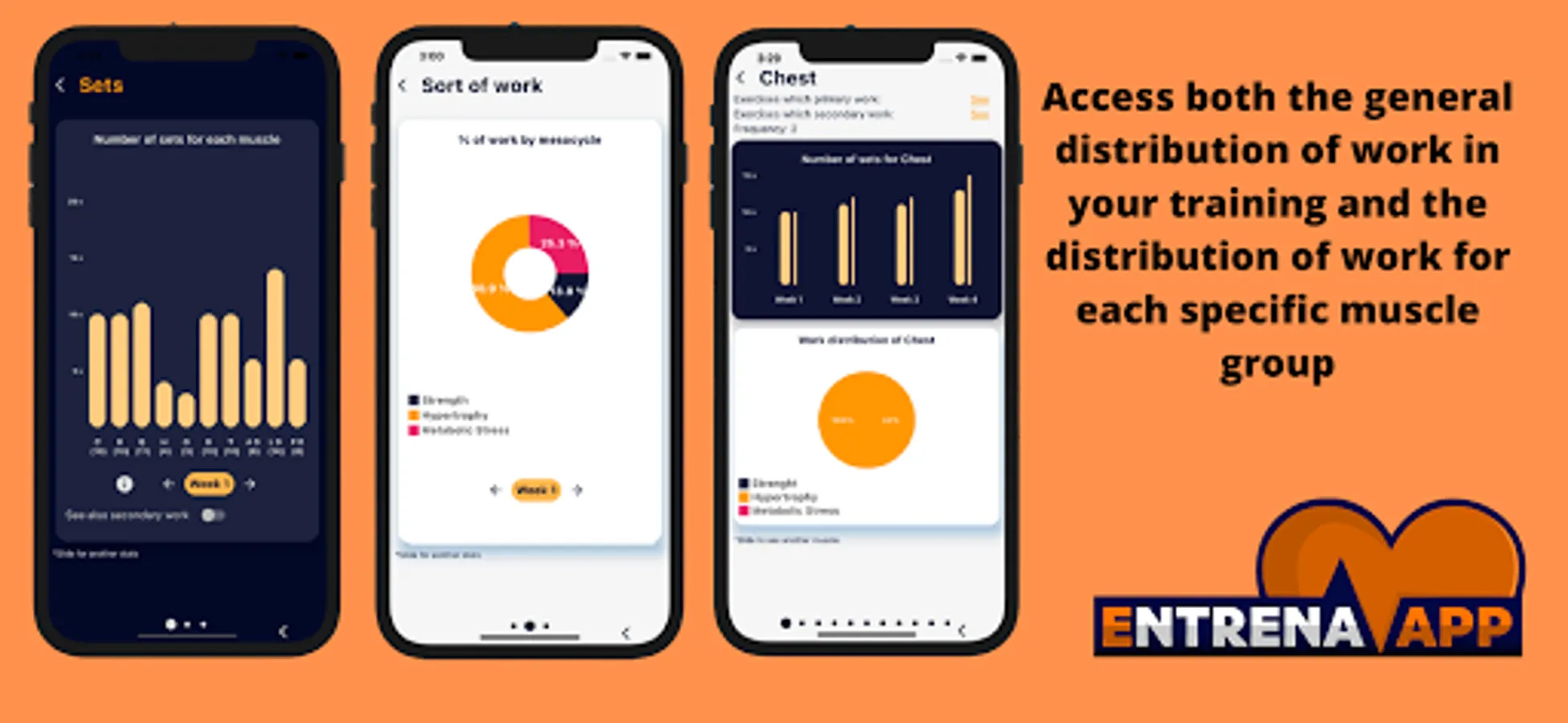 -Individual statistics of each muscle group: Check muscle by muscle the number of series you have each week, how the work is distributed in that muscle group, what exercises in your training routine work it in a primary and secondary way and how many times a week. week you work that muscle in your workouts.