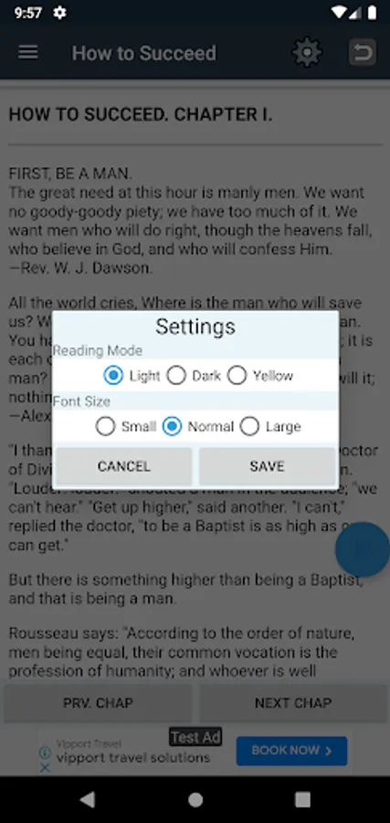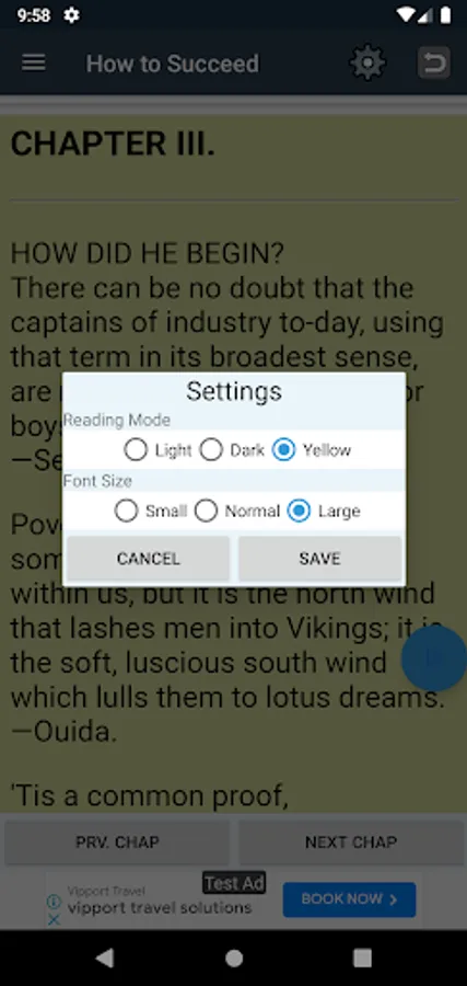 Choose between multiple reading modes to suit your environment and preference. Be it white and yellow pages for daytime or a dark mode for nighttime reads, find what works for you.
