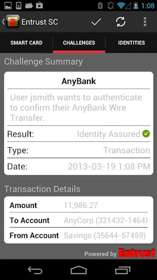 Entrust IdentityGuard Mobile Smart Credential is an innovative mobile application that transforms your mobile device into a virtual smart card / digital identity. Upon successful user activation with your credential issuer’s Entrust IdentityGuard server, the Mobile Smart Credential can be used in a variety of ways depending on the services enabled by your credential issuer. For example, it can be used to: