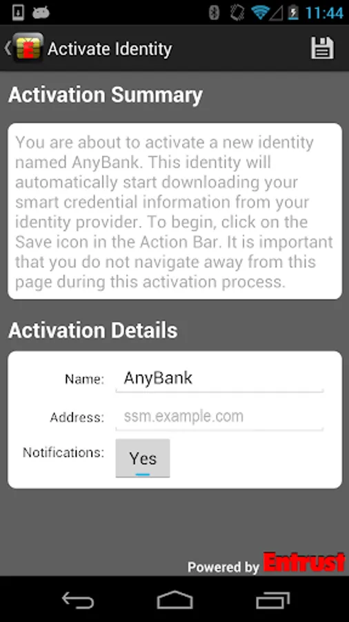 Entrust Mobile Smart Credential can only be used in conjunction with credential issuing organizations that have created an Entrust IdentityGuard account for you. To use the application, you will need to activate the Mobile Smart Credential with your credential issuer. Once you have downloaded the application please consult the organization you whom you wish to use the Mobile Smart Credential for activation instructions.