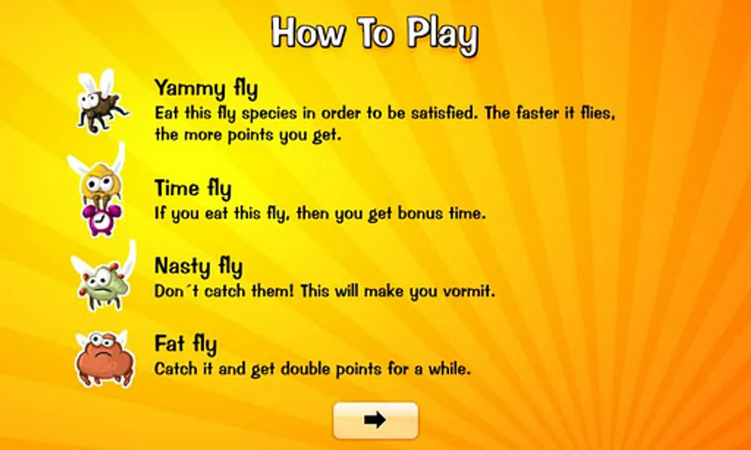 Eat special flies for better scores or time bonus. You also should know that not every fly is delicious!