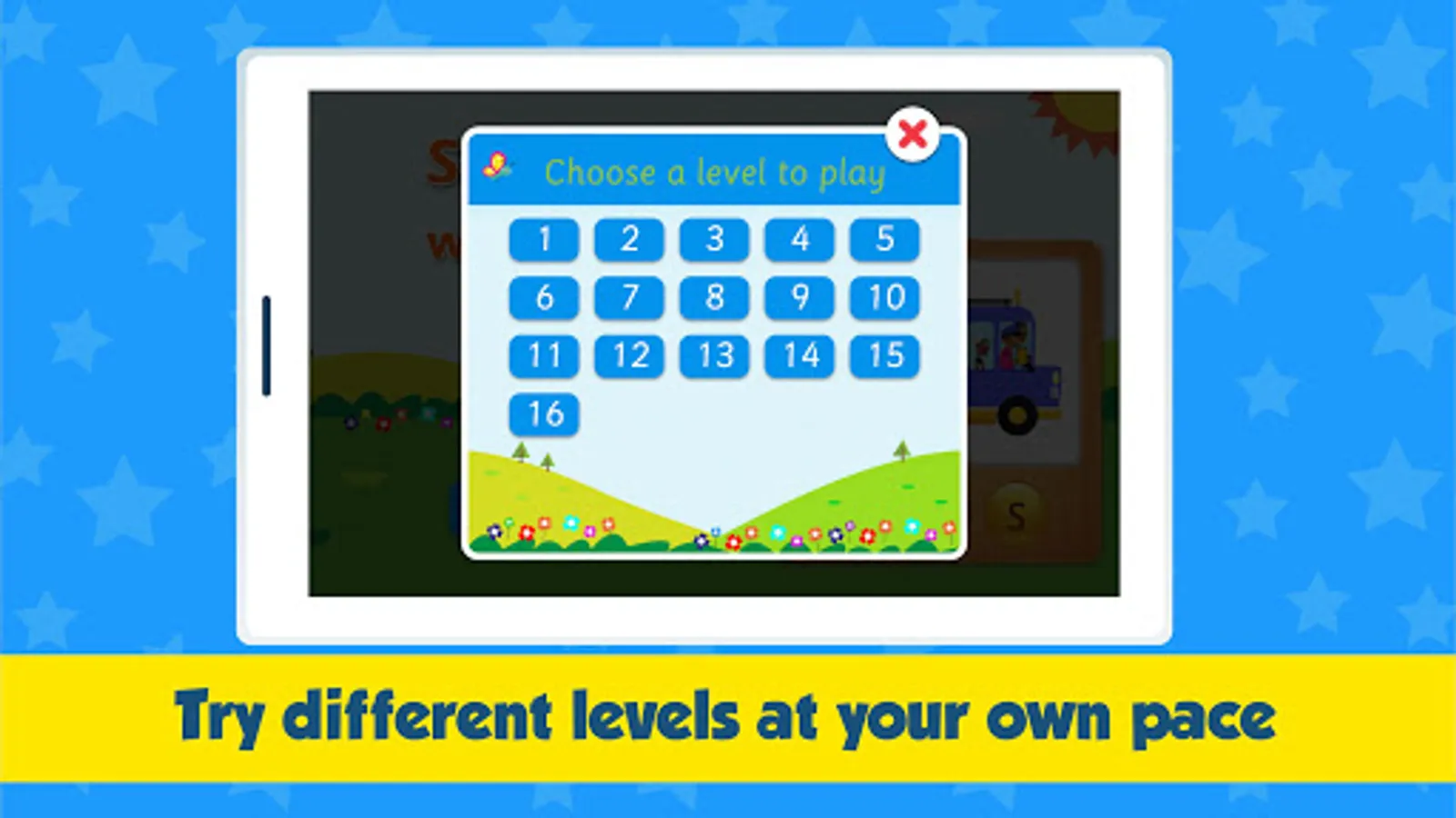 Select between 16 levels of difficulty from easy to challenging! Each level contains seven rounds of words to spell, placed on a game board, accompanied with images and spoken pronunciations.