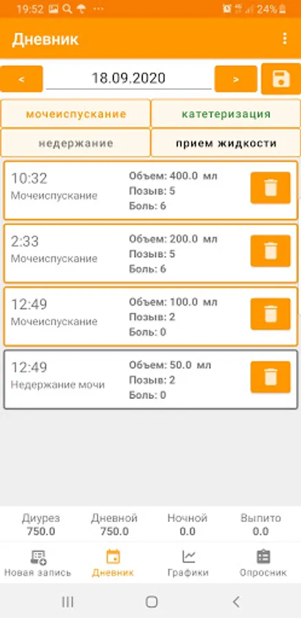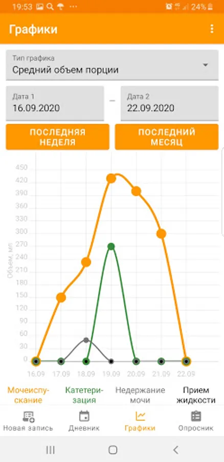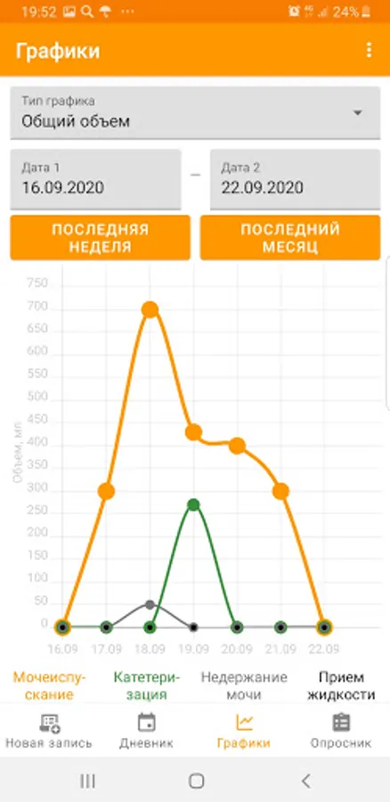 Приложение позволяет вести в электронном виде дневник мочеиспускания/катетеризации и приема жидкости. Формирует готовый дневник в виде PDF файла. Позволяет строит графики изменения различных параметров (количества мочеиспусканий, среднего объема порции, дневного и ночного диуреза и т.д.).
