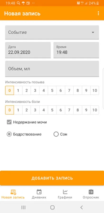 Также приложение позволяет в электронном виде Шкалу симптомов нейрогенного мочевого пузыря (NBSS).