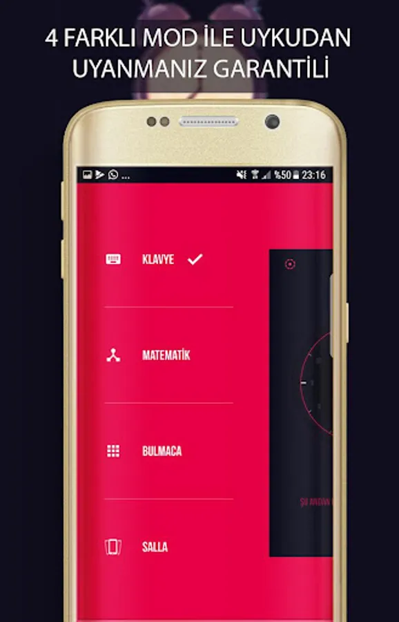 Alarm Clock Alarm Application 4 existing mode and shut down the alarm clock to solve them. The first one mode item you chose words özenlikl to that motivation of the author of the best and these words of alarm clock apps have also asked'll entry field you enter exactly the same type of above alarm clock application that will turn off the alarm application and sleep opened. Our other mode you trust your math operation maths, you can use an alarm clock application we choose this mode and the alarm goes off the moment will ask you 3 a math question processing if the alarm clock application that question can not answer right will continue if you steal alarm clock alarm so completely your sleep to solve this question It has to be opened. Another is the alarm clock mode if you have problems with others to solve the puzzle game more simplified this mode the alarm clock mode is right for you, because you will have fun and you will open and you'll be awakened from your sleep and sleep well. Last alarm clock mode by shaking the phone as if waking up in this mode will continue to play until the number of 100% on-screen alarm clock application so that we will have missed your sleep.