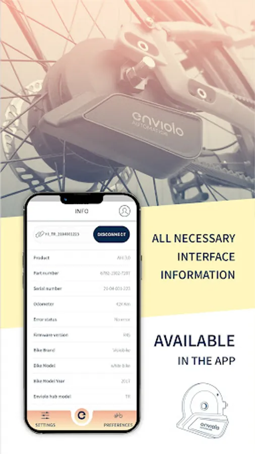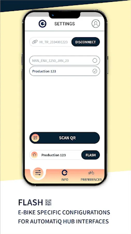 After successful pairing with an AUTOMATiQ hub interface the AUTOMATiQ app provides the essential options for bike rider, retail and OEM assembler. By scrolling through the navigation bar you'll be able to adjust the cadence setting within the 'Preferences' section. 'Info' will provide you all necessary hub interface information like serial number, odometer and bike model. And discover features like the 'start after stop' setting, hub interface firmware updates or calibration under the section 'Settings'.