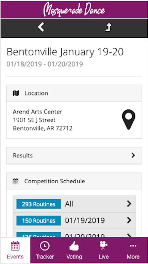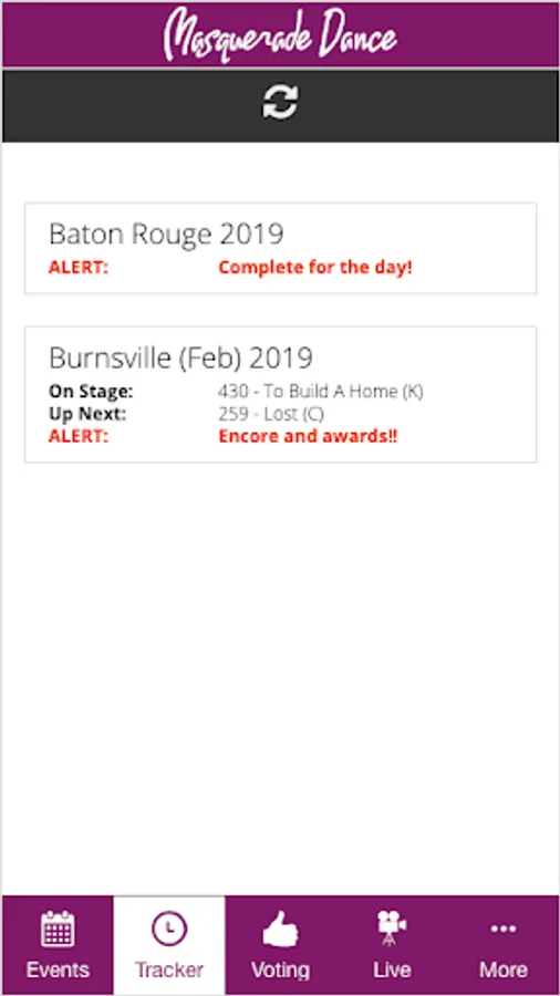 · A live Event Tracker - It shows what routine number is on stage, how long until the next awards session, and any alerts for important information at the competition.