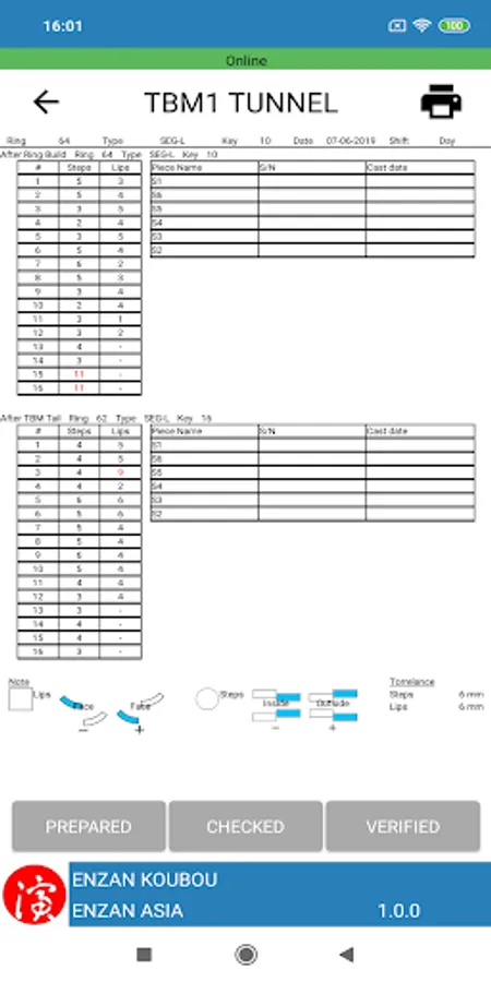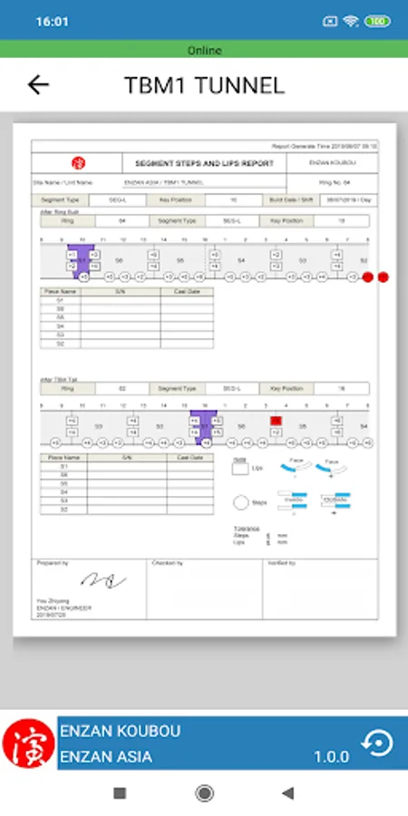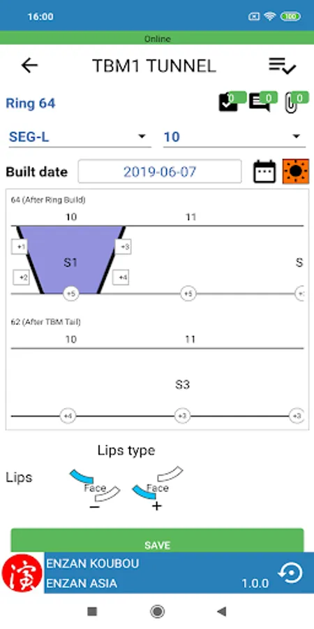 SAQ is Segment Assembly Quality system to record Lips and Steps. In enNote SAQ on the tablet device, user can input measured STEPS and LIPS after Ring build and After TBM Tail. Check and authentication also enable on the tablet device. After authentication, user can confirm the SEGMENT LIP AND STEPS REPORT from enScroll on PC.