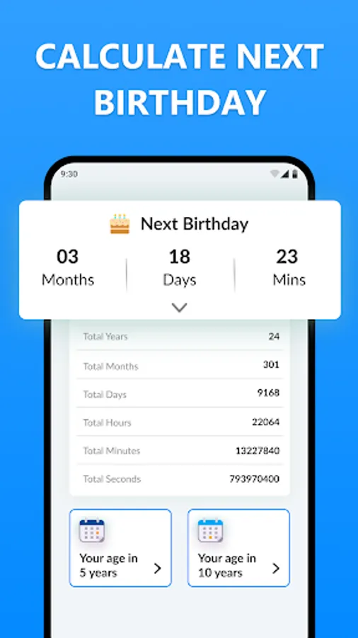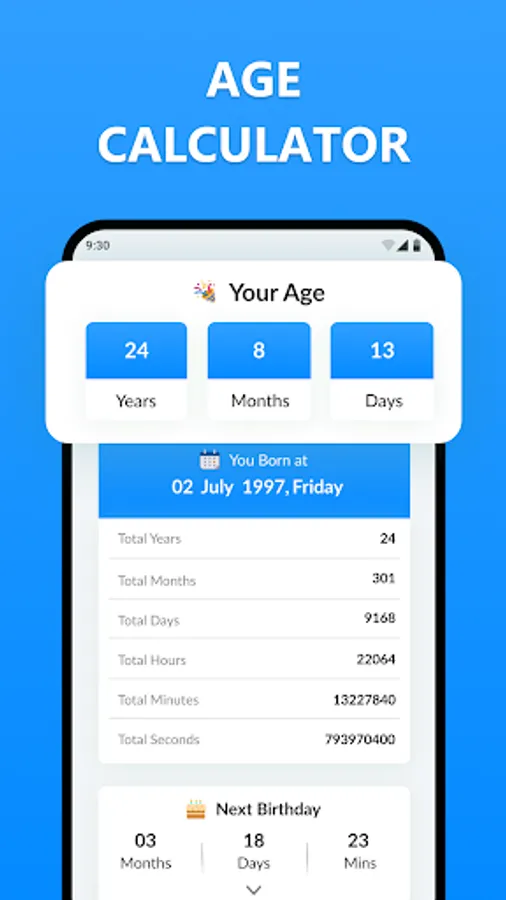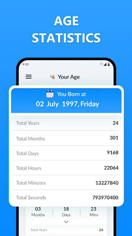The ager finder app calculates your actual age with multiple options. This date tracker shows you the complete timeline in hours, minutes, seconds, and even in milliseconds.