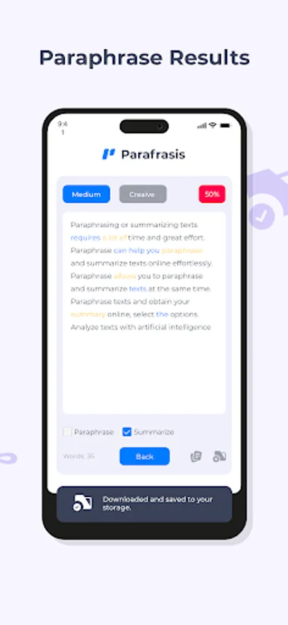 Our app comes with two different options i.e., paraphrase and summarize. Simply input your content into the app and select the required function to get results. Moreover, you can select both options to perform paraphrasing of texts and summarize the paraphrased text with one tap.