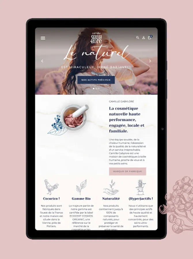 Camille Gabylore, another concept of cosmetics. High performance face & body treatments, an organic range, ingredients of natural origin and 100% French manufacture ...