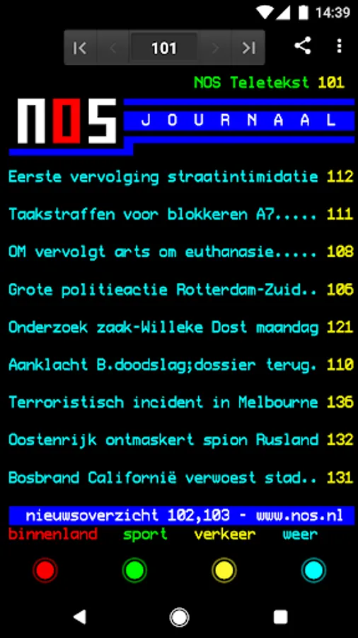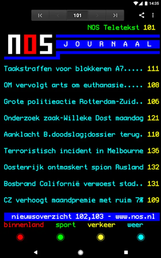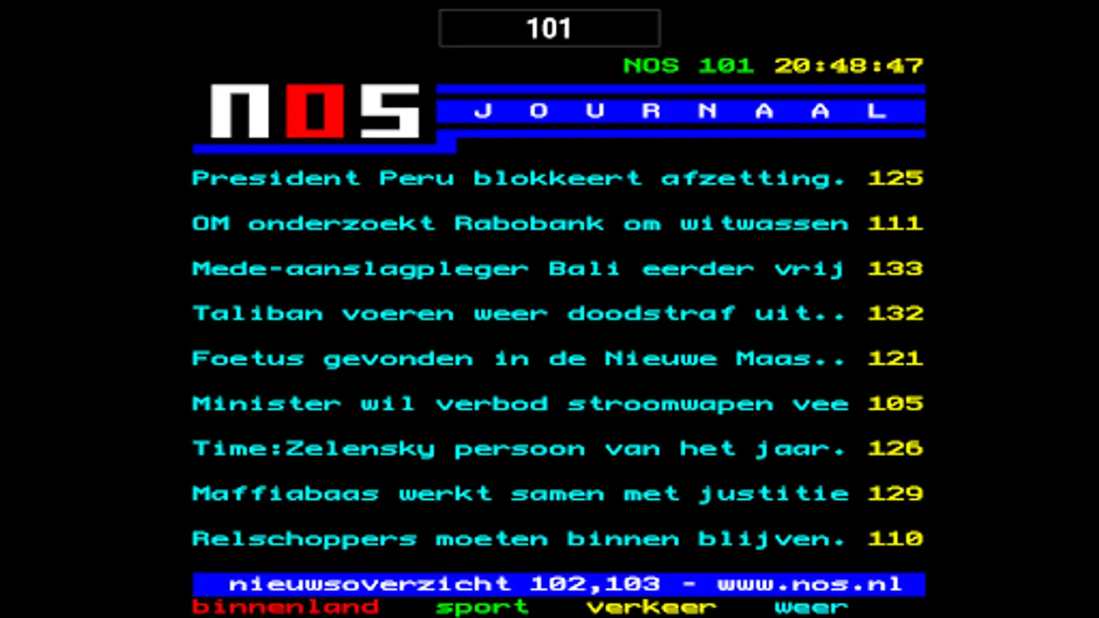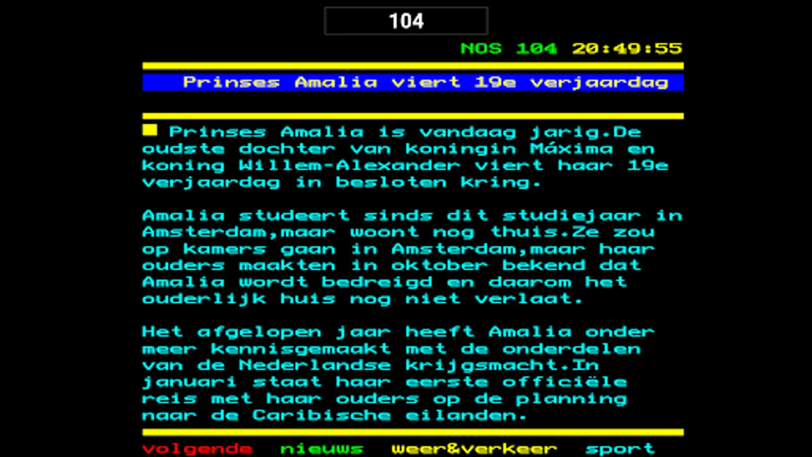 The NOS has developed a special NOS Teletext application for Android devices. With this application it is possible to quickly access the NOS Teletext pages, such as the current general and financial news, traffic information and sports results.