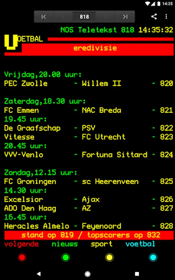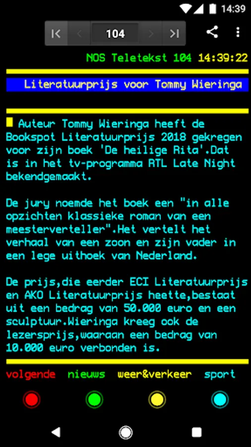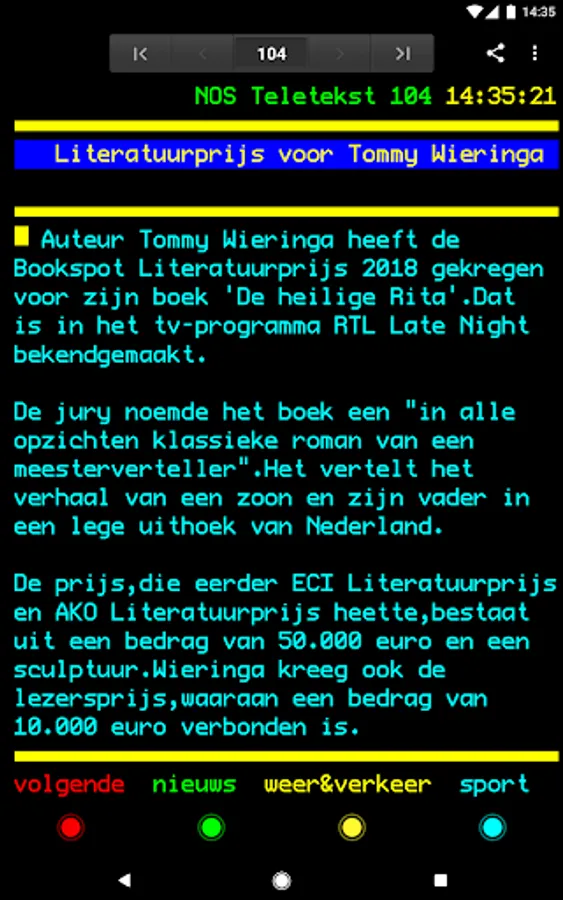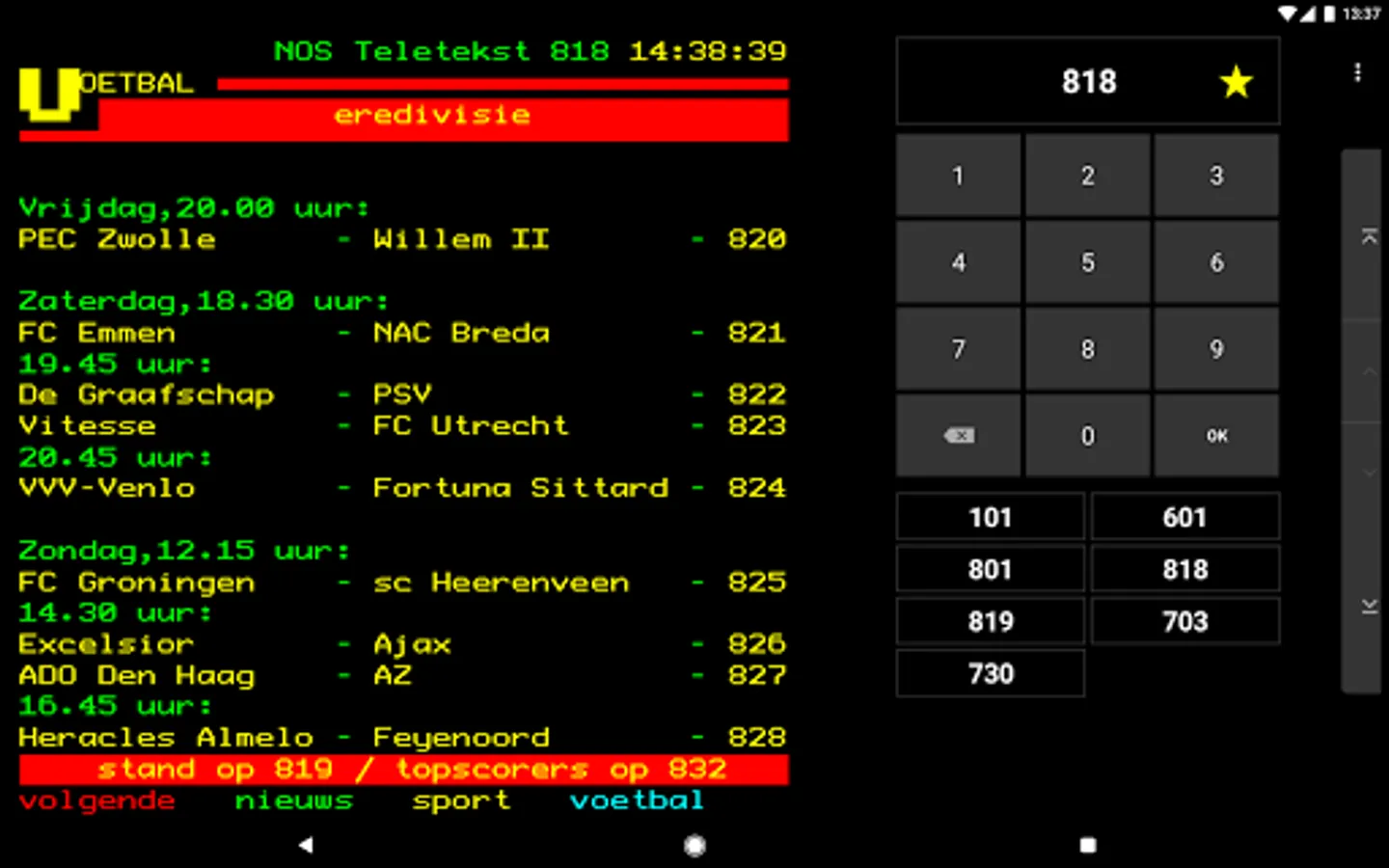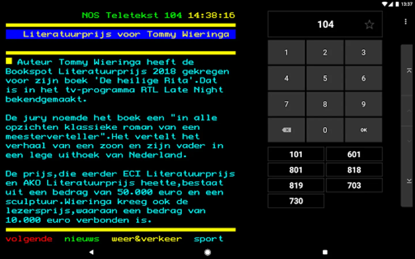 The NOS has developed a special NOS Teletext application for Android devices. With this application it is possible to quickly access the NOS Teletext pages, such as the current general and financial news, traffic information and sports results.