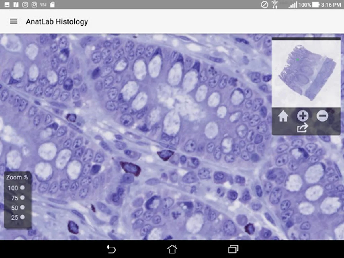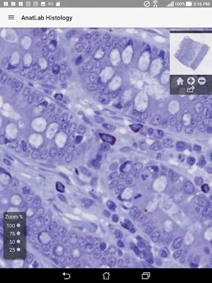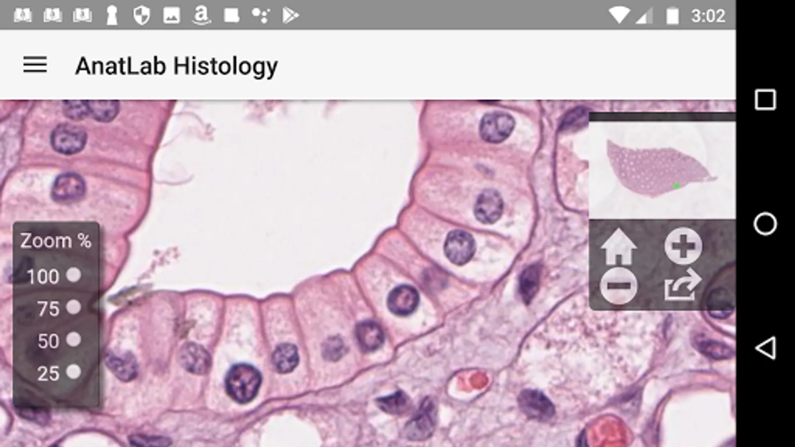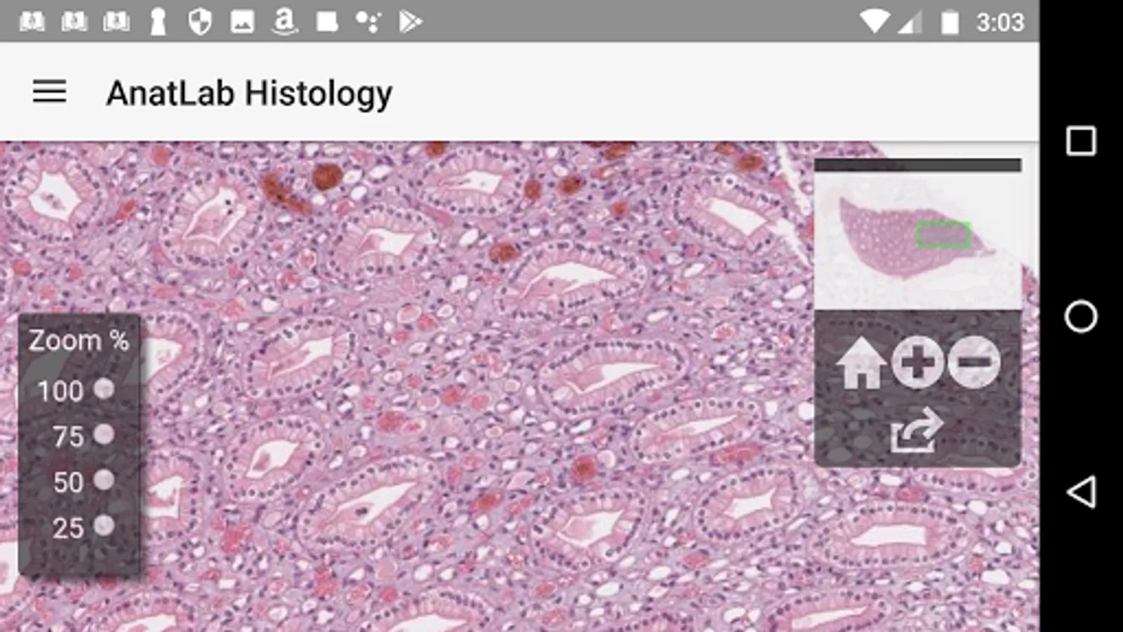 The AnatLab Histology Atlas app provides mobile access to a complete collection of ultra-high-resolution histology microscopic slide images. This system allows students, teachers, researchers, and the general public to explore the complete microscopic landscape of the body as if they were looking at a collection of actual slides on a physical microscope, all through the cloud via their Android mobile devices.