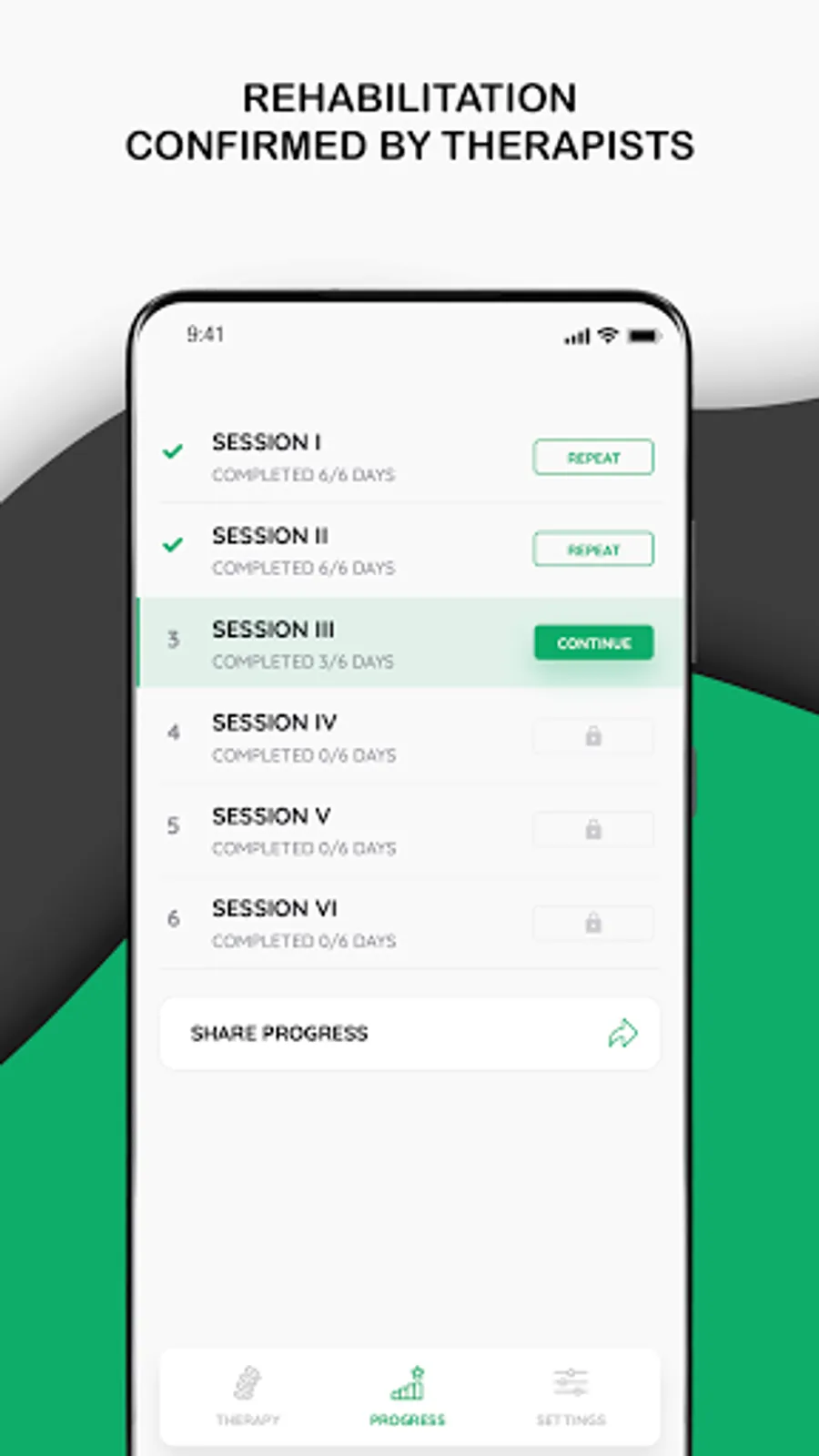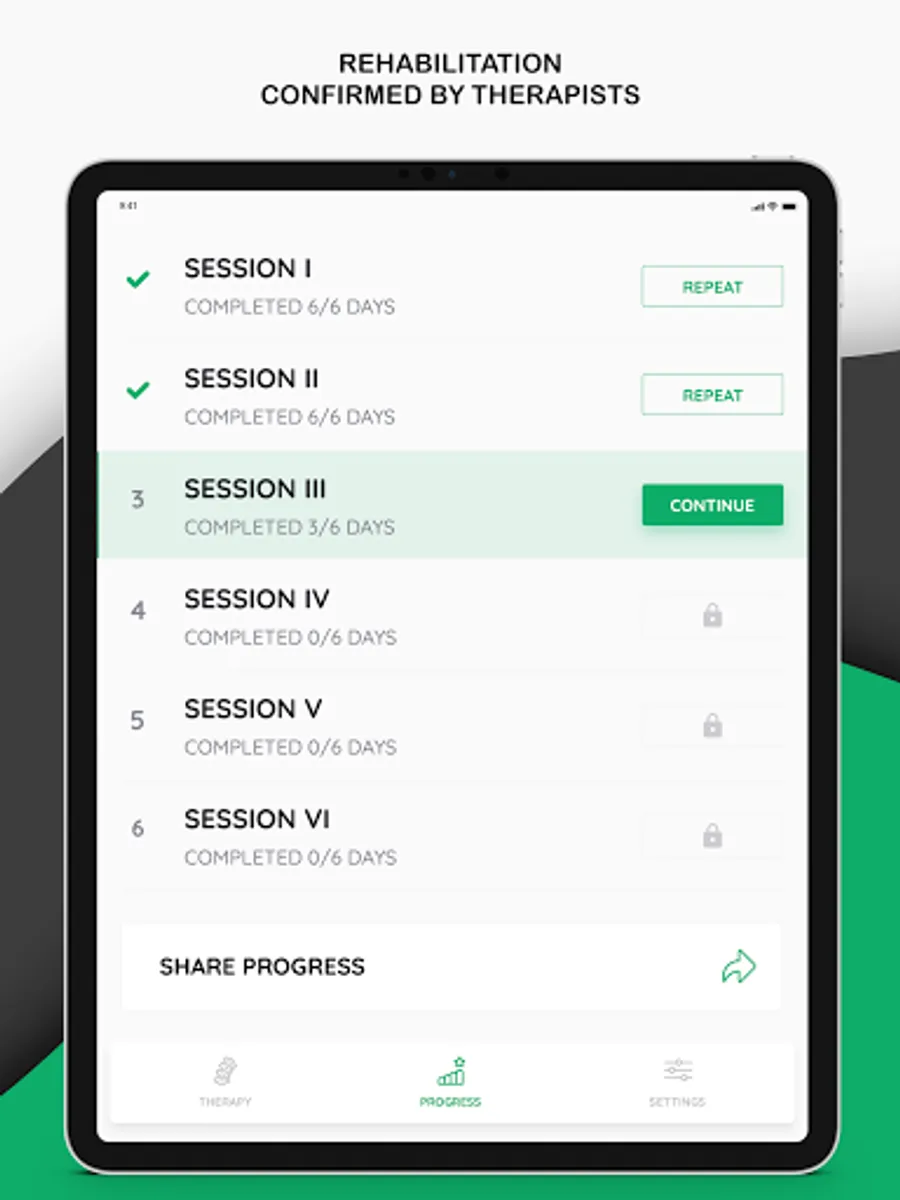 The app is equipped with detailed information on therapy, indications and contraindications, as well as knowledge about the disease. The built-in timer will remind you when it's time to perform the next rehabilitation according to your preferences.