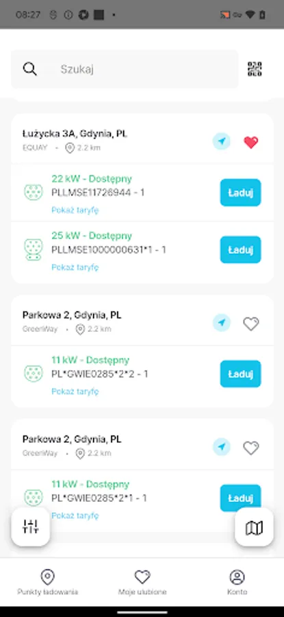 The application allows you to search for nearby charging stations. You can also search by city, zip code or charging station number. The search list shows an overview of the available charging stations and the distance to them.