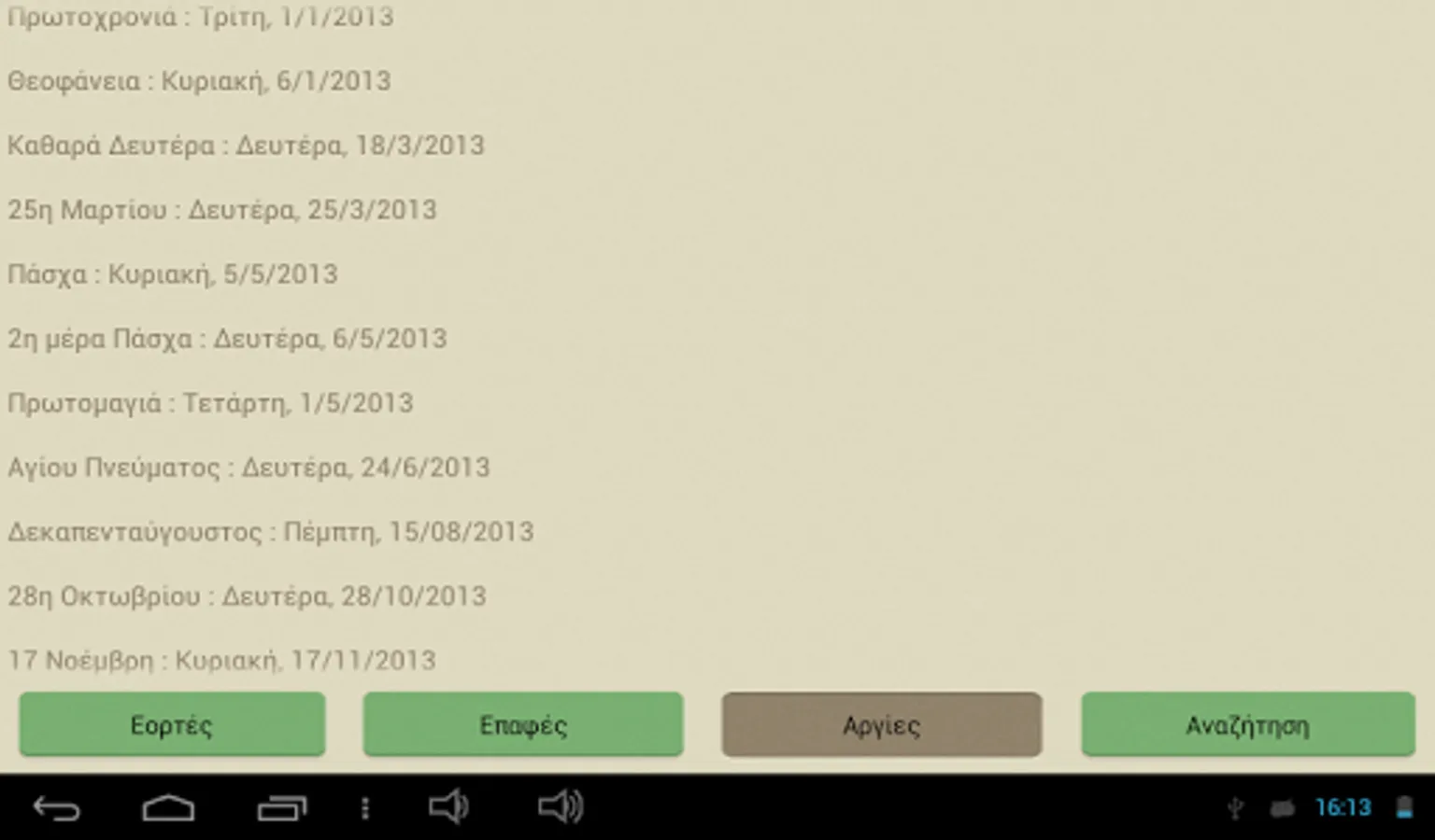 ✓ Εμφανίζει τις εορτές και τις αργίες του έτους σταθερές και κινητές.