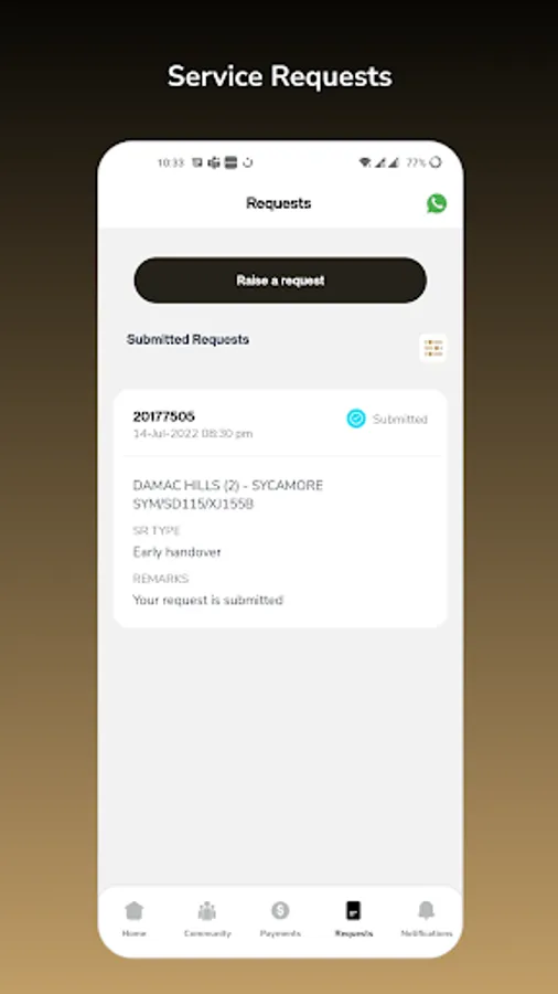 Raise various service requests like update your personal details, renewal of tenancy, proof of payment upload for property installments and service charges, NOC for Fit Out/Alterations with relation to your property and Access card requests for both Apartment/Villa’s.