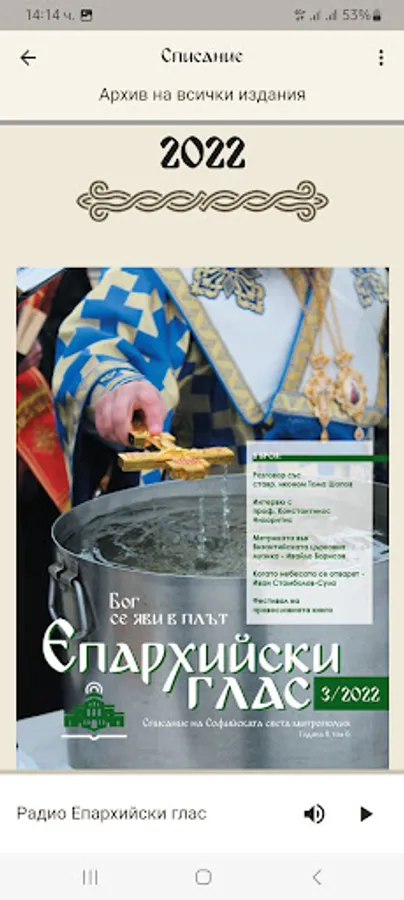 New printed issues of the magazine are published three times a year and are distributed in the churches and monasteries of the Sofia diocese, and the archive editions are available in PDF format in this application and on the official website: https://glas.mitropolia-sofia.org /