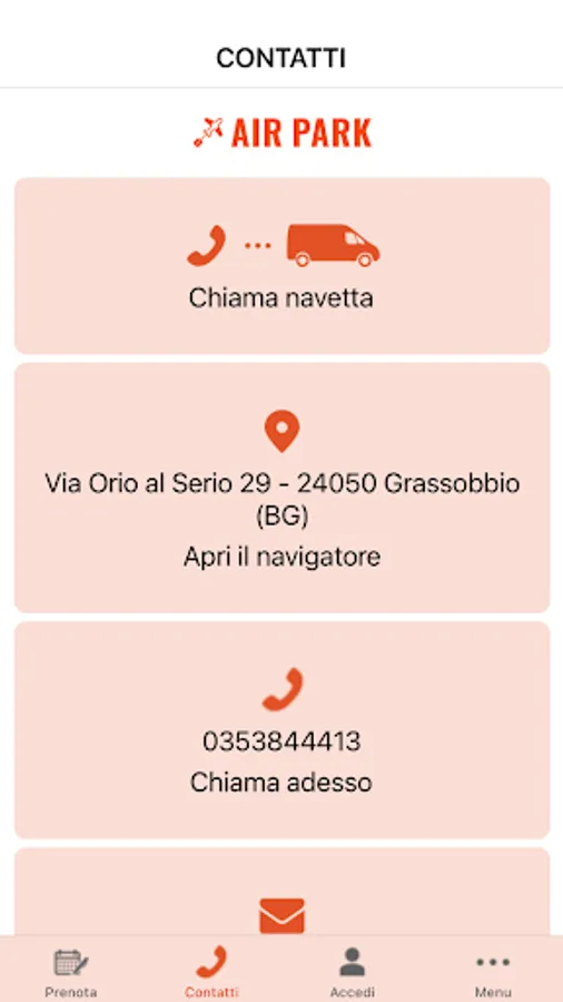 The AIR PARK car park also, through a specialized agency, also offers car rental services with driver, coach rental for groups, minibus and minivan rental with driver, air taxi and helicopter transfers. On request, it is also possible to use the Car Valet service, ie deliver the car to an AIR PARK representative directly at the airport's departure area, which will transfer it to the car park, to return it to you on your return, directly to the arrivals area of the airport. Bergamo Orio al Serio airport.