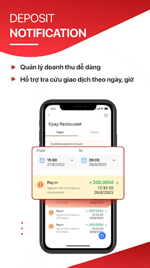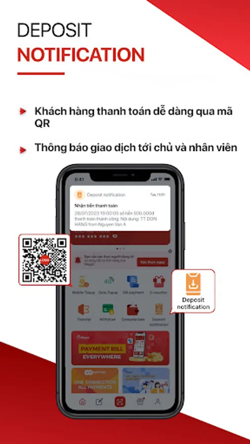 Providing collection solutions via QR codes and receiving notifications on the MegaV application (Deposit notification) to solve difficulties for store owners and employees in checking customer payment transactions and revenue statistics.
