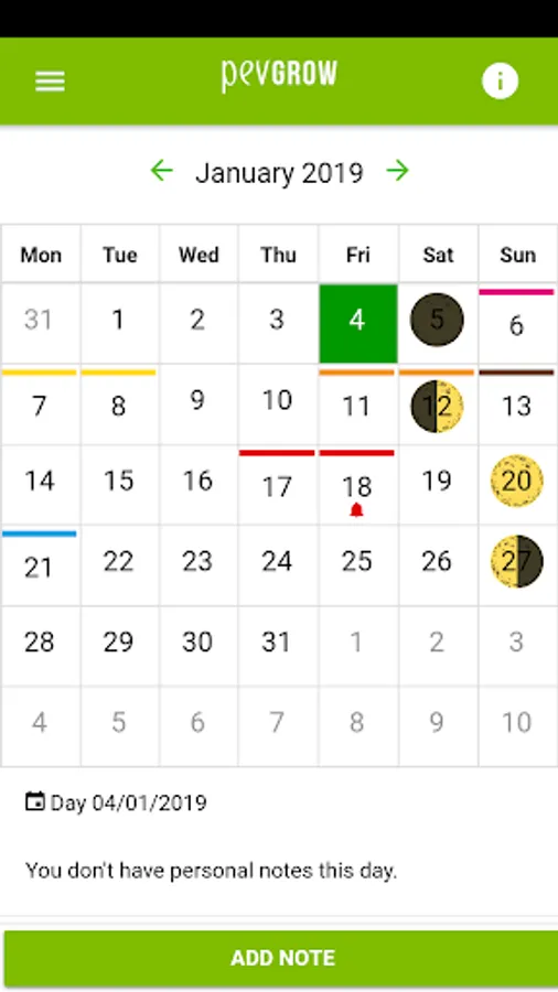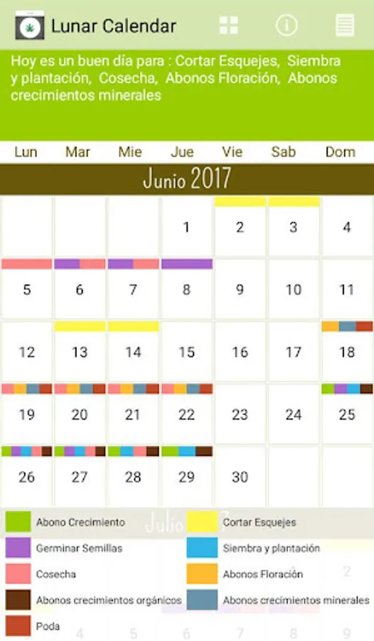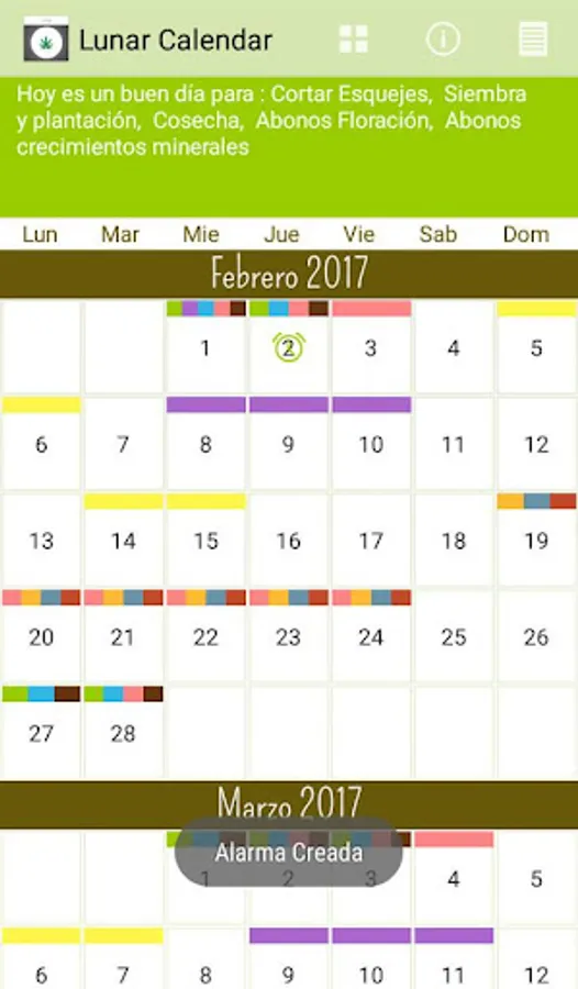 The working days are differentiated by colours according to the recommended action. You will also be able to activate reminders for as many days as you wish in order for you not to miss any cultivation tasks.